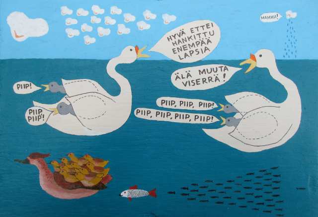 Asuntomme ovi on auki pimennettyyn porraskäytävään, jonka toisessa päässä avoimen hissikuilun edessä viimeisillään oleva 29-vuotias äitini pikkuveljeni Jarkko sylissään kehottaa oviaukossa seisovaa juuri kolmekymmentä vuotta täyttänyttä isääni ja minua tulemaan pommisuojaan. Äitini odotti veljeäni Hannua, joka syntyi muutaman päivän kuluttua ja kuoli parin kuukauden kuluttua suolitukokseen. Mutta jo vuoden kuluttua henäkuussa 1945 syntyi kolmas veljeni Timo. Neljä poikaa neljän vuoden sisällä. Vanha totuushan on, että sodan aikana syntyy poikia kaatuneiden tilalle.