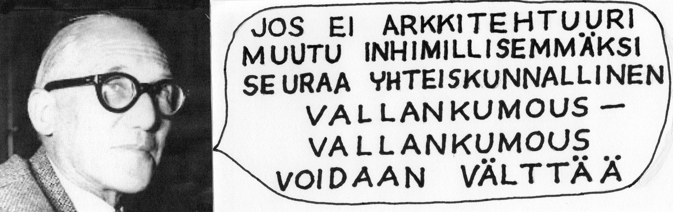 Arkkitehtuuri on sidottu yhteiskuntaan, aikaan ja paikkaan kuten kaikki äidit. Sitä kahlitsevat muotivirtaukset kuten kaikkia taiteita. Muodin ote on rautainen. Tai pitäisi sanoa teräksinen ja lasinen. Vapaasti ajattelevat ihmiset seuraavat sitä kuin lammaslauma. Voi sitä joka uskaltaa poiketa laumasta. (Muodista enemmän seuraavassa blogissa.) Muotia on vaikea muuttaa. Usein siihen vaaditaan vallankumous. Corbu selittää asian näin päin: