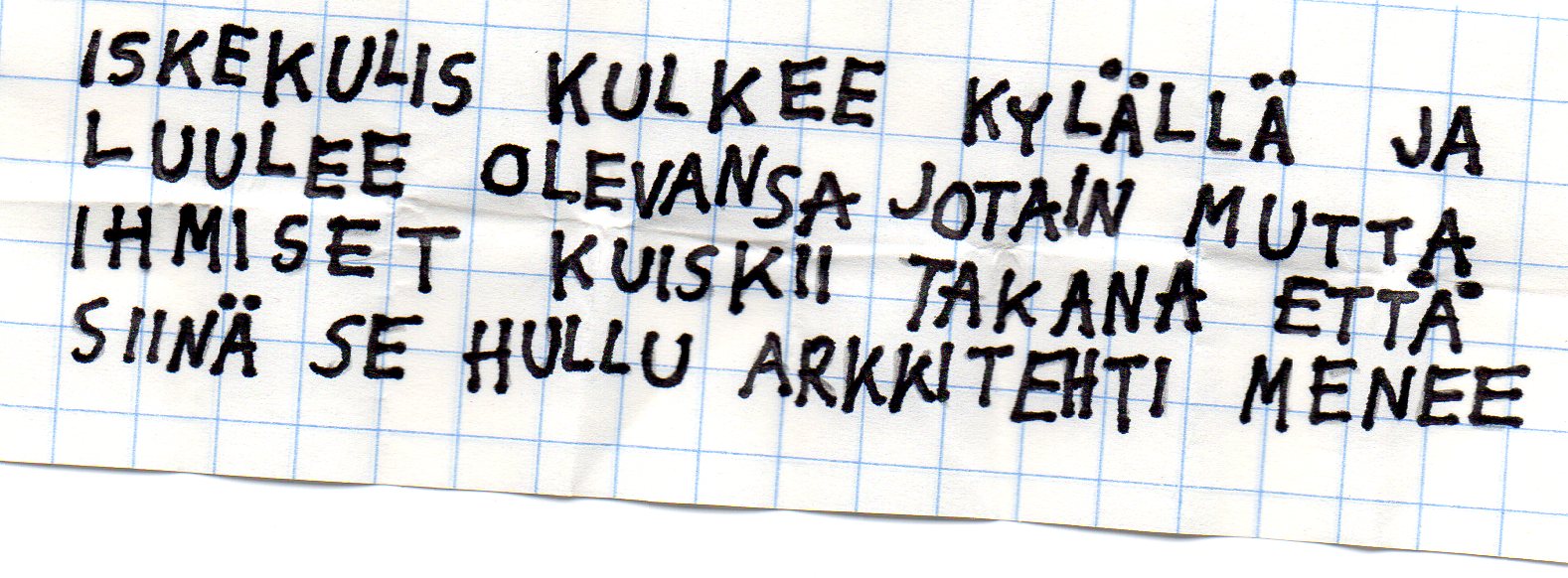 Aloin selata blogeja. Huomasin Pentti Muroleen pitävän kylähulluja tarpeellisina. Lukeudun mieluusti näihin. Olen hyvässä seurassa. Sinne! Tunnuskin on jo valmis. Lähiökylässä, jossa asuin, olin jo saanut tämän statuksen kolmekymmentä vuotta sitten. Asia paljastui, kun juuri kirjoittamaan oppinut tyttäreni kävelyretkellämme pudotti pikuruikkuisen paperinpalan tielle. Kumartuessani sitä ottamaan hän sanoi, että se on sinulle. Avasin moneen kertaan taitetun lappusen laskoksistaan. Siinä se oli tikkukirjaimilla: