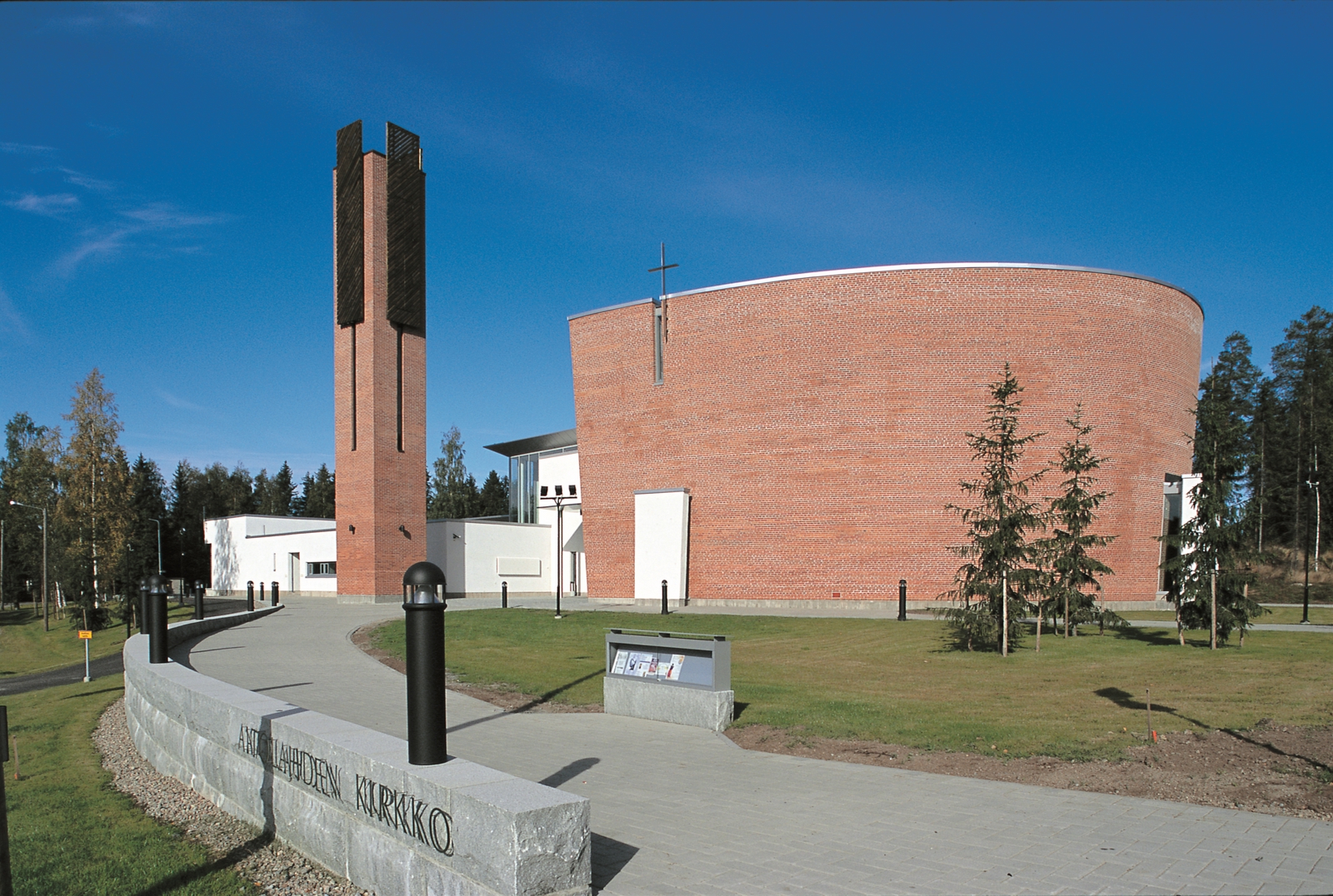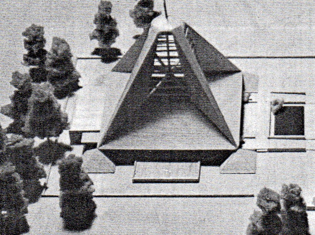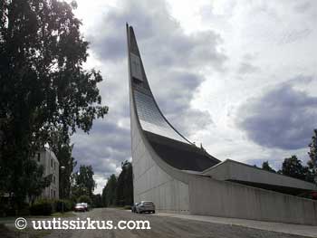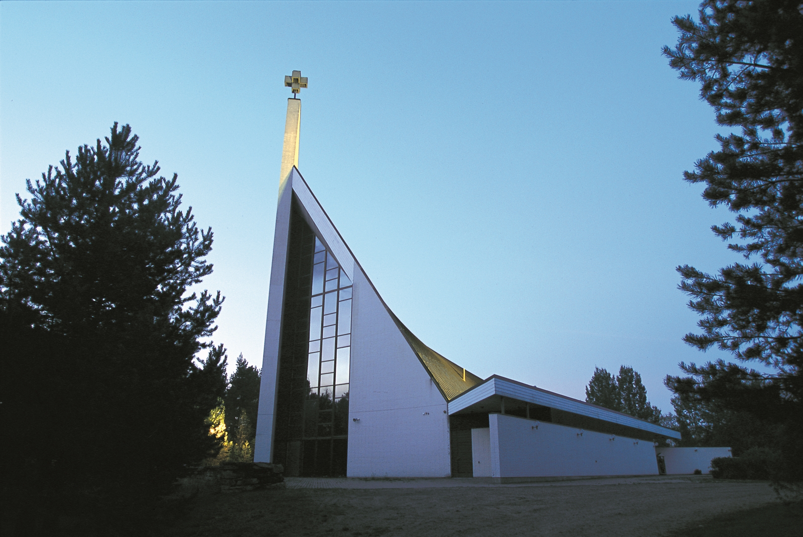 Markus Tavion Meilahden kirkko (oikealla) vuodelta 1954 muistuttaa tätä ulkonäöltään suuresti. (Kaikkia tämän artikkelin kuvia voi ja kannattaa suurentaa klikkaamalla)