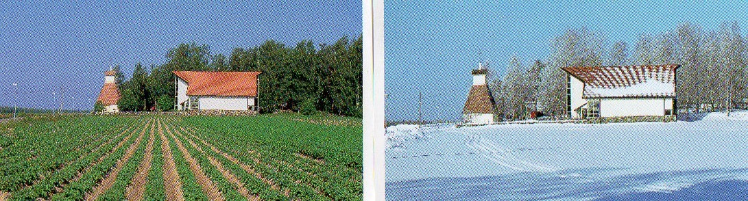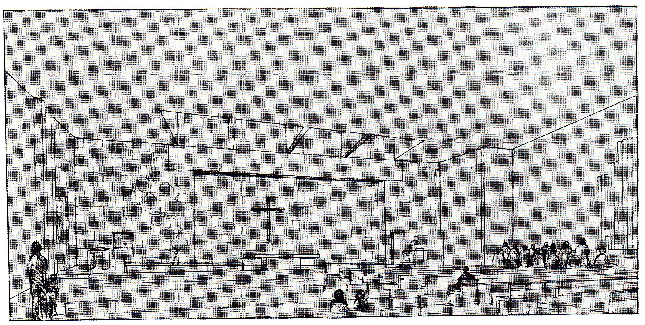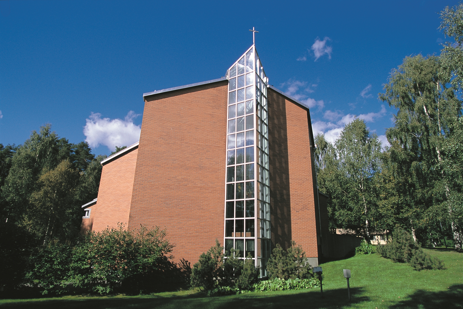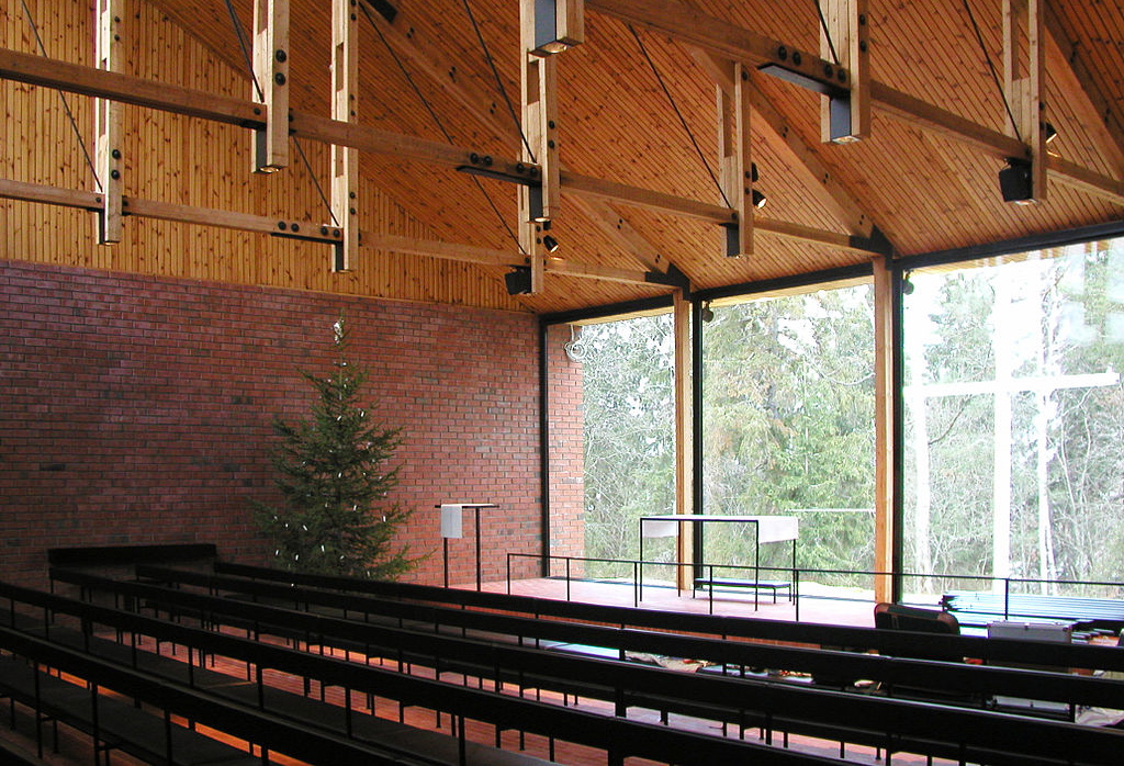 Markus Tavion Meilahden kirkko (oikealla) vuodelta 1954 muistuttaa tätä ulkonäöltään suuresti. (Kaikkia tämän artikkelin kuvia voi ja kannattaa suurentaa klikkaamalla)