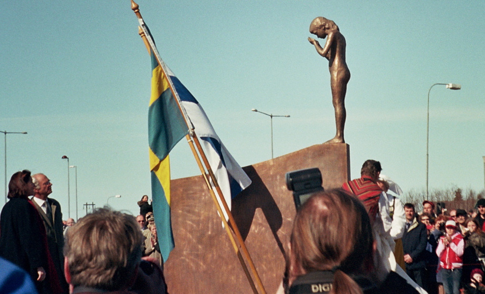 Sotalapsi-patsaan paljastustilaisuus Haaparannassa huhtikuussa 2005. Paikalla olivat molempien maiden päämiehet. Vasemmalla patsaan suunnittelija arkkitehti ja sotalapsi Anna Ruusuvuori yhdessä Ruotsin kuninkaan kanssa.