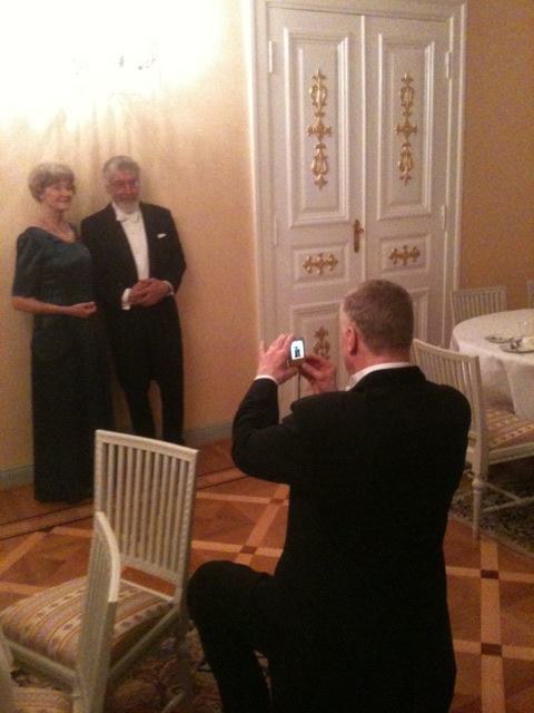 Kierroksemme jatkui ja huomasimme olevamme Keltaisessa salissa. Pyöreän pöydän ääressä kansanedustaja Sirpa Asko-Seljavaara miehensä kanssa vinkkasi meitä istumaan, mutta sitä olimme jo tehneet tarpeeksi ja halusimme nyt vain kävellä tiloihin tutustuen. Pöydän toisessa päässä seisoi jonkun toisen miehen kanssa luokkatoverini, Sanoma-konsernin hallituksen puheenjohtaja vuorineuvos Jaakko Rauramo, joka yllättyi nähdessään minut täällä. Tapaamisemme sattui sopivasti, sillä olimme juuri etsineet henkilöä, joka voisi ottaa vaimosta ja minusta valokuvan. Jaska suostui kuvaajaksi ja asetti meidät keltaisen seinän eteen kristallikruunun alle. Hän polvistui eteemme kuvausasentoon viittoillen kädellään meitä siirtymään milloin parikymmentä senttiä vasemmalle tai oikealle.
