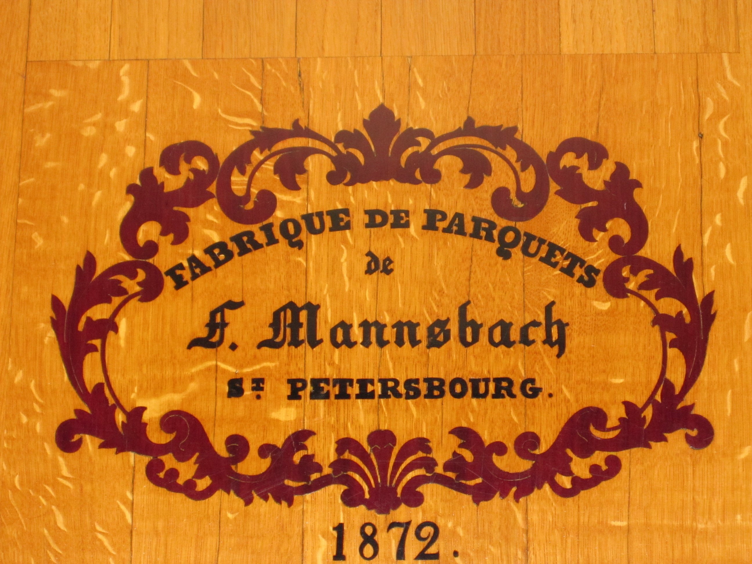 Valmistajan leima linnan Keltaisen salin parketissa.