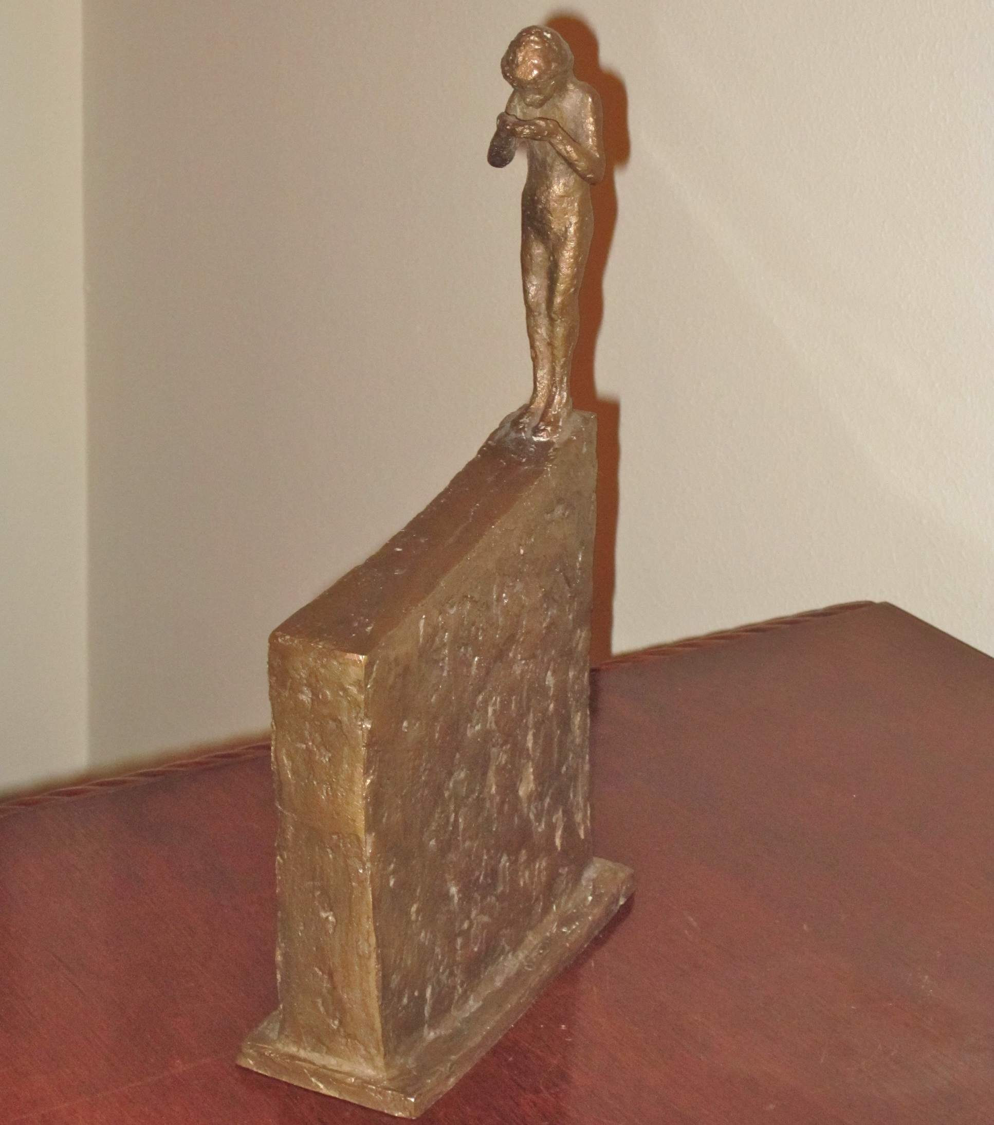 Eteläesplanadin puoleisessa pienessä huoneessa pöydällä seisoo pronssinen miniatyyri sotalapsi-patsaasta.