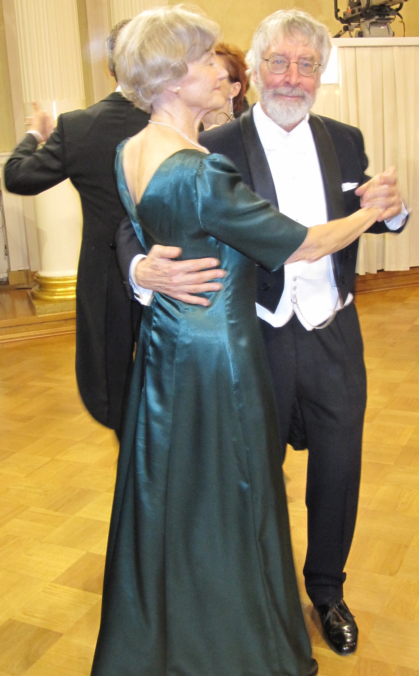 Kyllästyttyämme kiertelemään huoneissa ja katselemaan Munsterhjelmin, Edelfeltin ja von Wrightin maalauksia siirryimme jälleen parketille, jossa nyt oli väljempää median poistuttua paikalta. Tanssin pyörteissä meillä oli iloinen ja lämmin kohtaaminen arkkiatri Risto Pelkosen ja hänen vaimonsa kanssa. Risto on vaimoni kollega ja vanha työtoveri. Tanssilattialla pyöri myös kolme rullatuolitanssijaa. Ajattelin pitäisikö heidän kanssa mennä tanssiin. Toinen mieleen syöpyvä näky oli kaksi vanhaa mustalaisnaista, jotka hienoissa leningeissään istuivat yksinään pienellä penkillä orkesterin vieressä. Vaimoni meni puhuttelemaan heitä ja kehui heidän asujaan. Kaartin soittokunta oli nyt pienentynyt tanssiorkesteriksi saksofoniryhmineen ja laulusolisteineen. Samalla musiikin melu oli nyt noussut sille tasolle, että meidän täytyi korvia pidellen poistua salista.