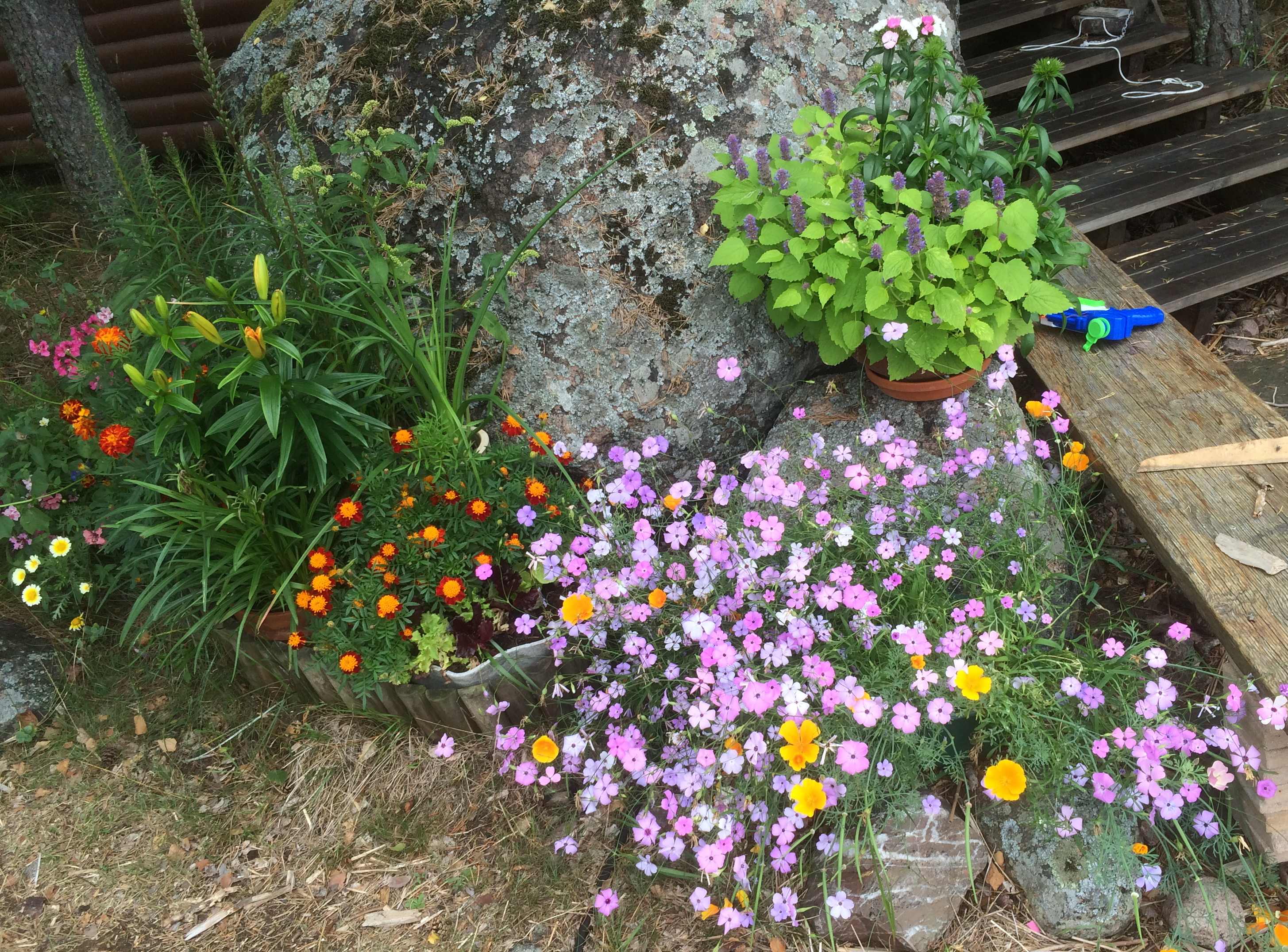 Vaimon siemmenistä kasvattama kukkatarha ruukuissa kukkii koko kesän eri värein. Foto B.S-A.