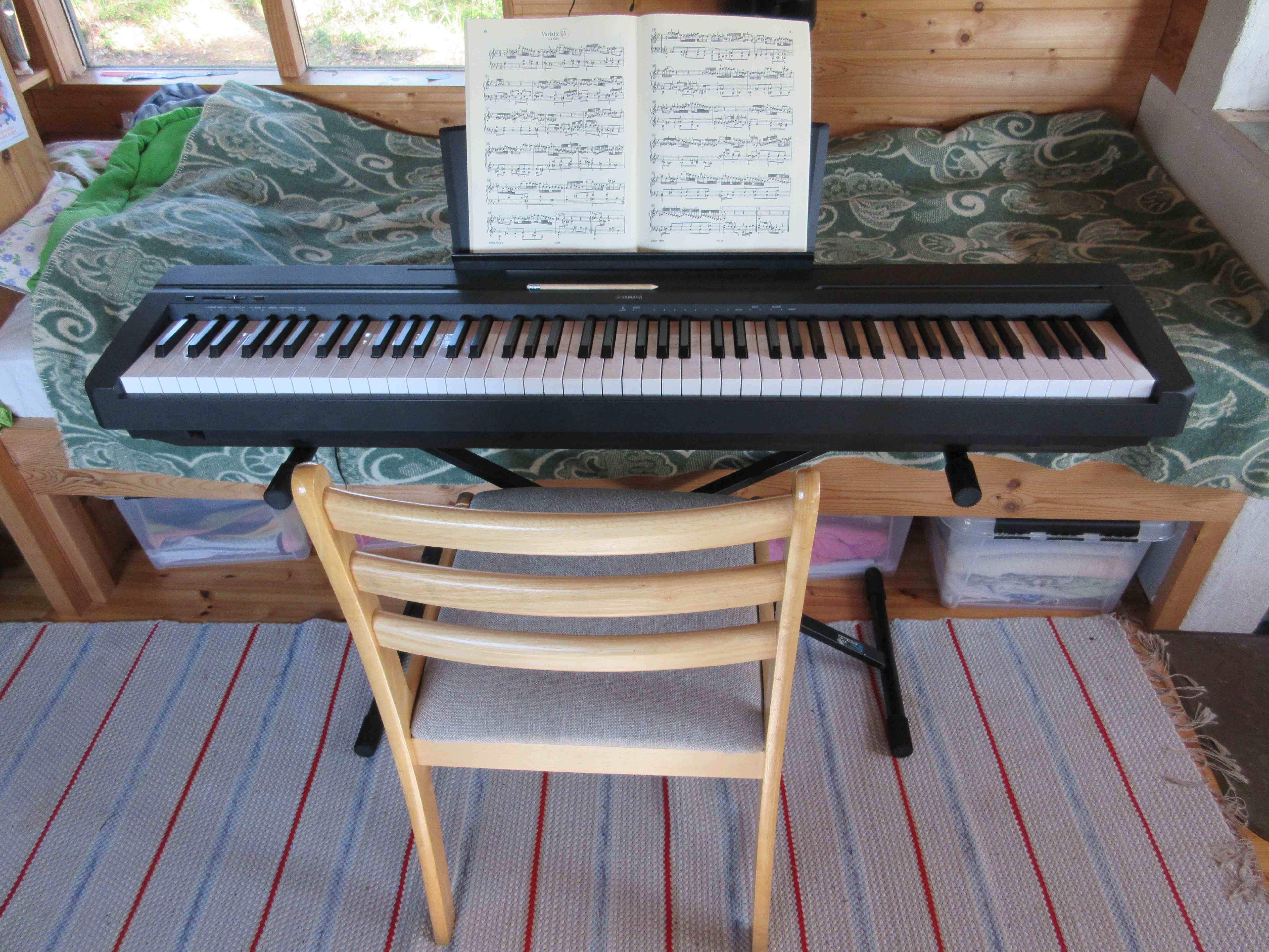 Viime vuonna hankin halvalla käytetyn 12 voltin sähköpianon. Sopii hyvin aurinkosähkösysteemiin ja kuluttaa erittäin vähän akkuja. Soittopeli talvehtii hyvin saarella eikä viritys muutu.