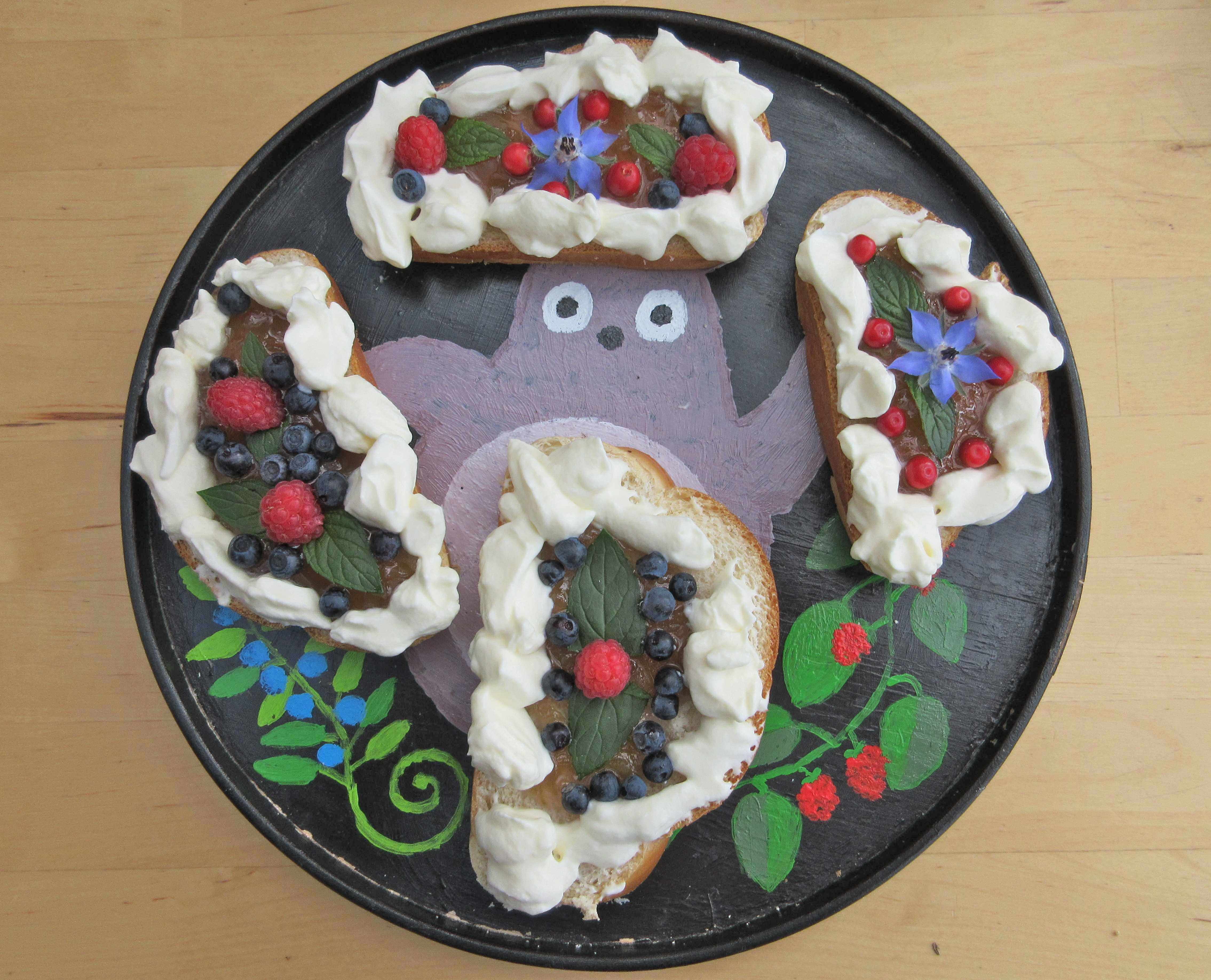 Hullun arkkitehdin kehittämä ”saariston hätävara-leivos” Totoro-tarjottimella. Kardemummapitkon reunoilla on kermavaahtoa. Muut ”mausteet” tulevatkin saaresta. Kompostin reunalla kasvatetusta raparperista tehty hillo, mustikat, vadelmat ja puolukat sekä mintun lehdet ja kurkkuyrtin kukat.