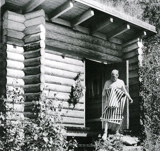 Alvar Aalto on suunnitellut savusaunankin hirrestä itselleen Muuratsalon kesähuvilalleen 1954. Maestro itse poseeraa.