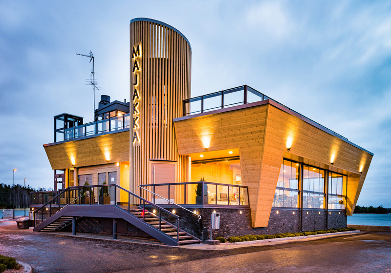Nokkalan kahvila Majakka, Espoo, 2016. Arkkitehtisuunnittelu ja toteutus Tapartia Oy. Liimattua massiivihirttä ja lasia. Kuten sanottu hirrestä voi tehdä mitä vaan. Kattoterassi vihitään ensi kesänä.
