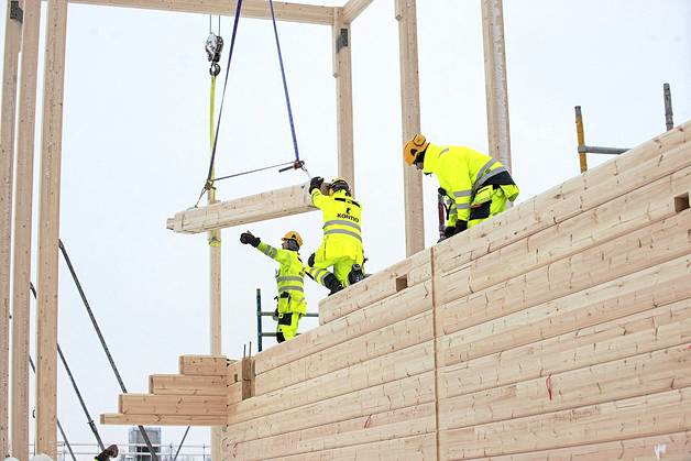 Pudasjärven koulun työmaa. Ulkoseinämateriaalina on 27,5 senttiä paksu kahdeksasta osasta liimattu massiivihirsi, joka täyttää lämpöeristysvaatimukset ja on terveellinen rakenne. Ristiinliimattujen puuosien ansiosta seinärakenne ei painu kuten perinteiset hirsitalot. Vertaa tätä Gallen-Kallelan ”rakennus”-maalaukseen yllä, jossa ”kuolema” kairasi kuvassa näkyvät hirsien pystyreiät. Nyt ne tehdään tehtaalla. Ei mitään uutta auringon alla.