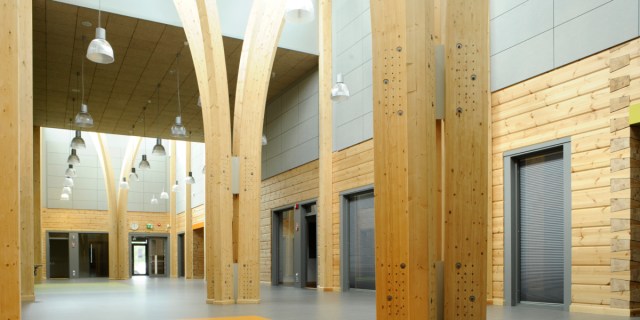 Pudasjärven koulu 2016, arkkitehti Pekka Lukkaroinen, maailman suurin hirsitalo n. 10 000 neliötä, useita rakennuksia.