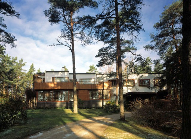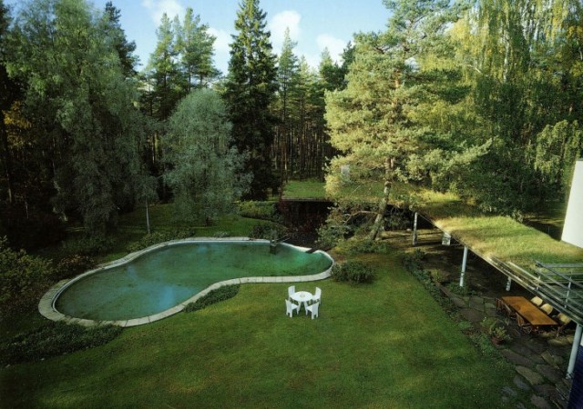Alvar Aalto, Villa Mairea, Noormarkku, 1939. Sehän on yksin keskellä mäntymetsää eikä naapureita näy. Pelin henki on sama kuin Villa Paavossa.