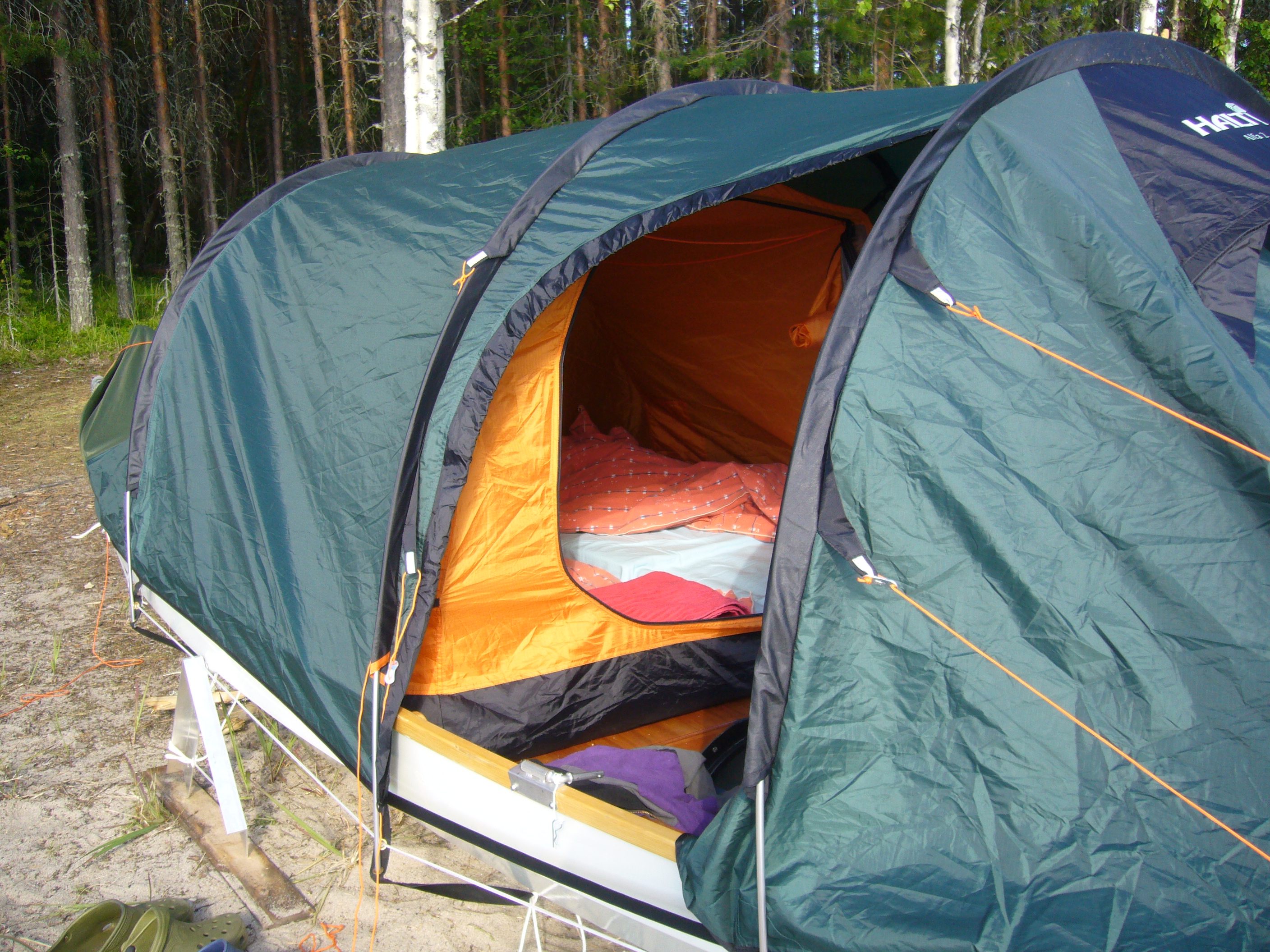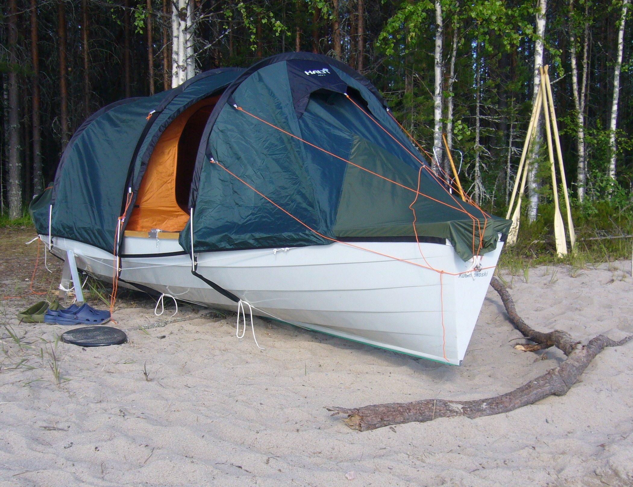 Vene on valmistettu kuuden millin mahonkivanerista. Leveä keskituhto toimii teltan makuualustana. Sen alla on reilu vesitiivis säilytystila telttaa ja retkivarusteita varten.