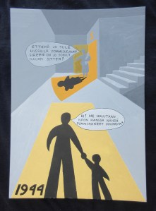 Varhaisimmasta muistikuvastani on kohta 75 vuotta. Tapahtumapaikka Munkkiniemi. Länsitie 17 B ( nykyinen Solnantie 32 ). Porraskäytävä Helsingin helmikuun 1944 suurpommituksen aikaan. Samassa korttelissa kuin nykyinen Ukko-Munkin ravintola. Selkeä kuva tapahtuneesta on kummitellut mielessäni positiivisella tavalla vuosikausien ajan. Oli pakko maalata tämä kuva viime kesänä. Eihän siitä kovin kummoinen taideteos tullut, mutta mitä voi vaatia ”juuri kolme vuotta täyttäneeltä” (kuva suurenee klikkaamalla):