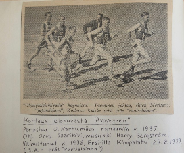 Juoksijan lahjojensa ja ulkonäkönsä perusteella isäni pääsi ”elokuvatähdeksikin” vastavalmistuneella olympiastadionilla vuonna 1938 filmatussa suositussa elokuvassa ”Avoveteen”, jota uusintanäytöksinä esitetään tv:ssä vieläkin vuosittain. Sakarin rooli oli olla ”eräs ruotsalainen”, joka alussa johti kilpailua, mutta lopussa ”joutui” päästämään kaikki kolme suomalaista edelleen. Rooli oli isälleni vaikea, koska hänen piti juosta niin hitaasti. Ruotsi oli lyöty hulmuvatukkaisen, juuri isäni ”ohittaneen”, vaalean Kullervo Kalskeen viedessä voiton! Eläköön Suomi-Filmi!