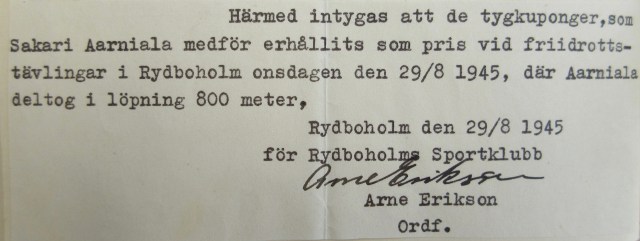 Kesällä 1945 isäni kilpaili jälleen menestyksekkäästi Ruotsissa. Palkintoina oli tällä kertaa mm. ”kangaskuponkeja”, joiden avulla huolitellusti pukeutuva Sakari saattoi valmistaa itselleen uuden puvun. Jottei tällä kertaa tullissa tulisi ikävyyksiä tuomisien kanssa tullissa, antoivat kilpailujen järjestäjät todistuksen: