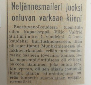 Asuimme silloin osoitteessa Iso Puistotie 6 (nykyinen Munkkiniemen Puistotie) ylimmässä kerroksessa. Äitini kuuli yöllä ääniä vintiltä ja komensi isääni katsomaan mitä siellä tapahtuu. Kaksi varasta pakeni palotikkaita kadulle ja ”neljännesmaileri” sai toisen heistä kiinni. Uutisessa kiinnitty huomio journalismin senaikaiseen käytäntöön. Rosvot saa kyllä mainita nimeltä, mutta ”sankari” on vain ”eräs”.