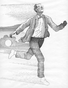 Isä juoksee itselleen uuden puvun. Valjeni Timon piirros.