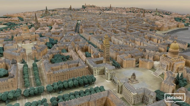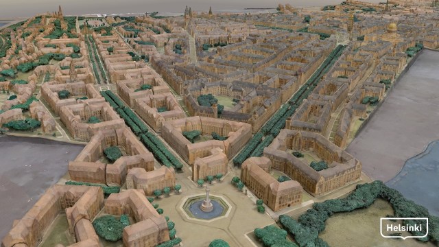 Munkkiniemi-Haaga suunnitelma 1915. Kaupungin hiljattain tettämä 3d-virtuaalimallinnos Loja Saarisen nikkaroimaan valtavan pienoismallin pohjalta.